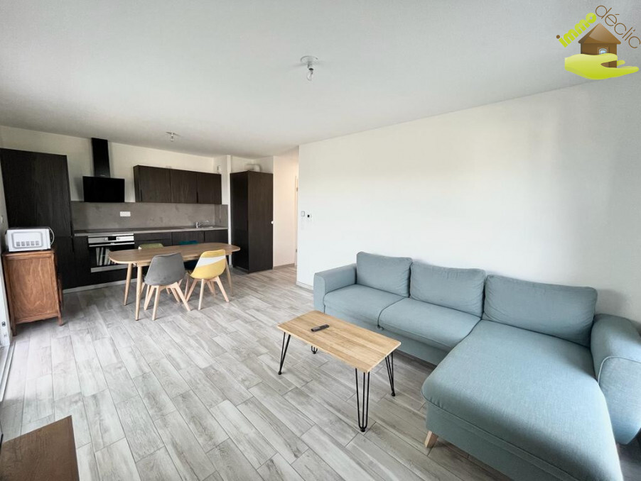 Une entrée avec placard, une cuisine entièrement équipée ouverte sur le séjour, accès à une terrasse de 11,53 m², 2 chambres, un WC séparé et une salle d'eau avec douche.