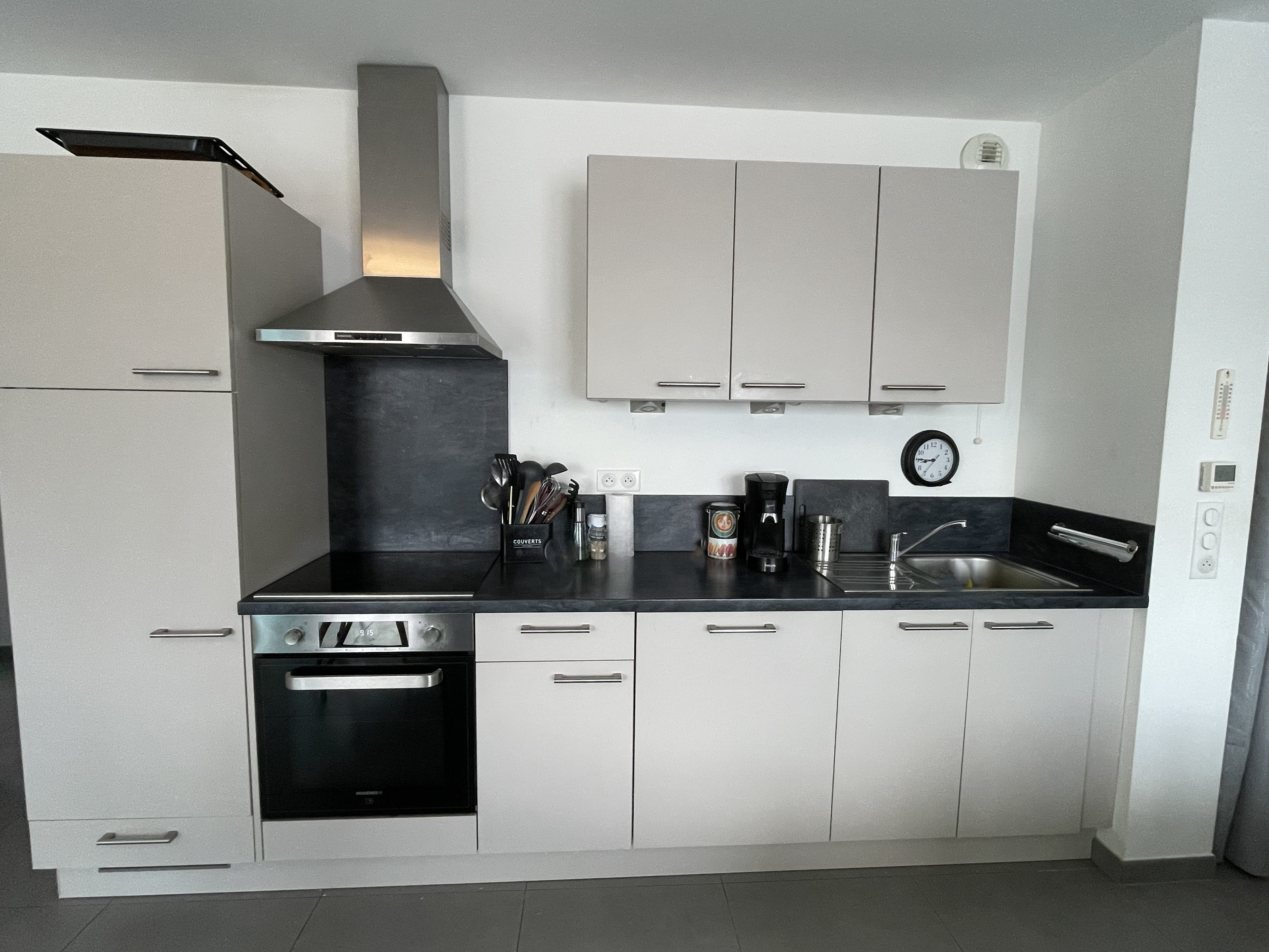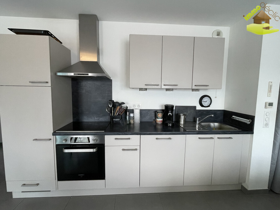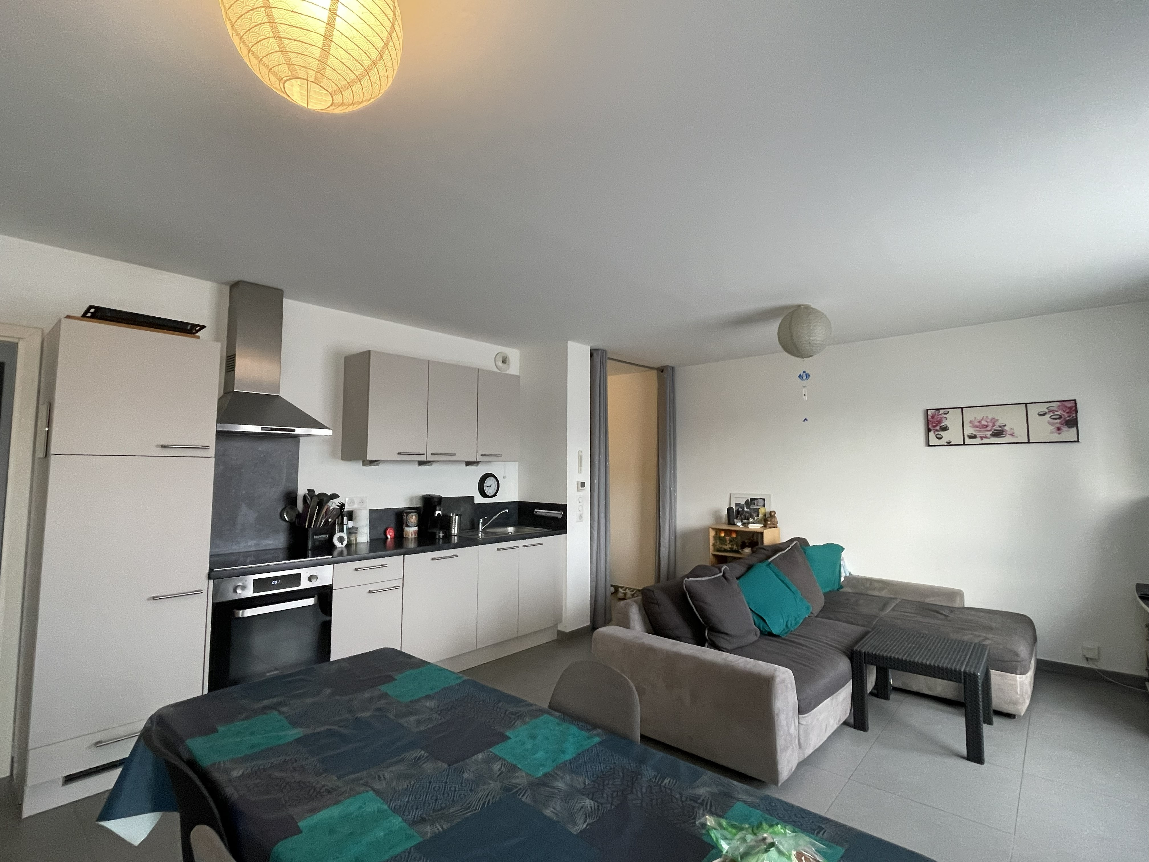Une entrée avec placard, un salon/séjour avec cuisine équipée.