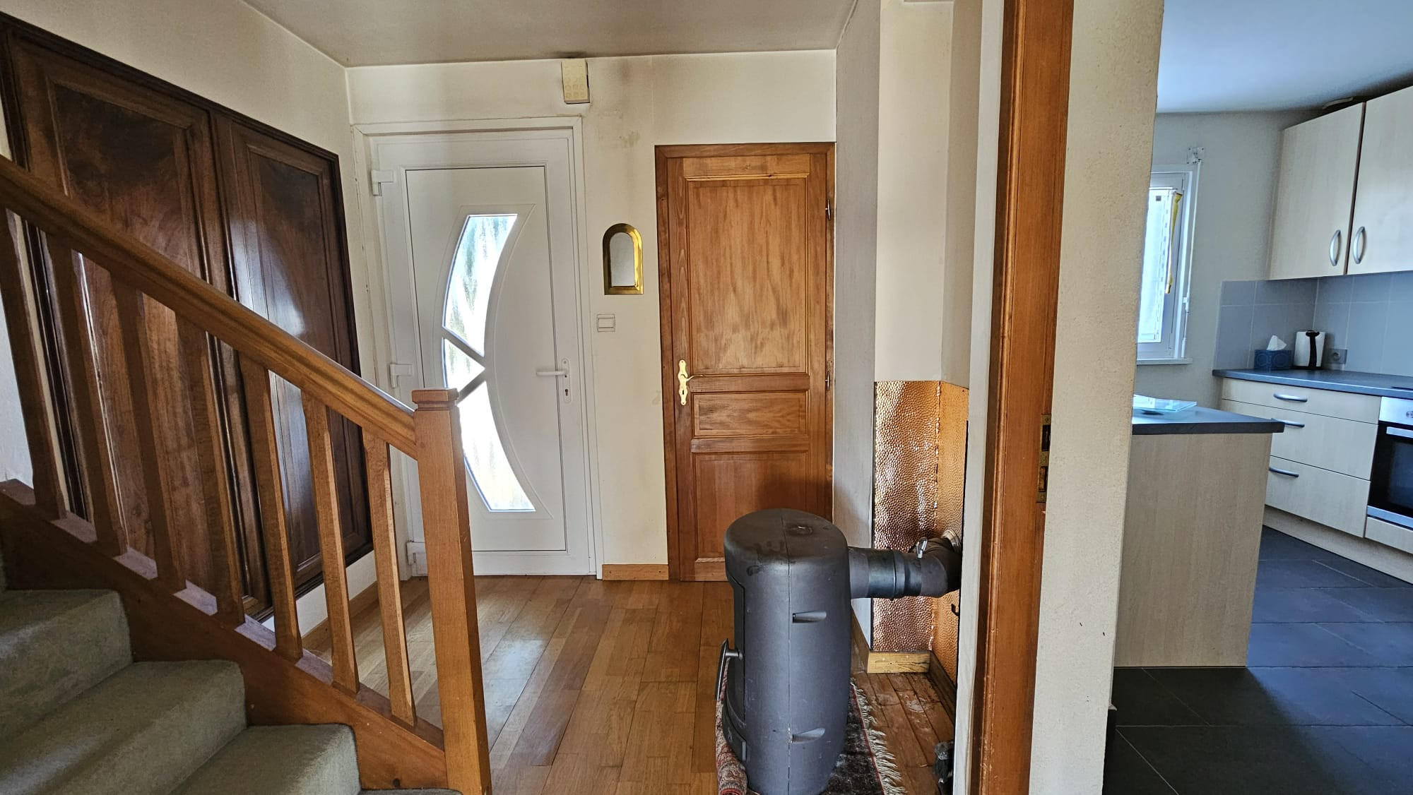 Au rez-de-chaussée, vous découvrirez une entrée avec placard et poêle à bois, un WC avec lave-mains, une cuisine indépendante équipée et un lumineux salon-séjour parqueté avec accès direct à la terrasse.