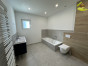 A son entrée, un long couloir dessert toutes les pièces : un WC séparé avec lave-main, 3 chambres, une salle de bain familiale avec WC, une baignoire, une douche et double vasque.