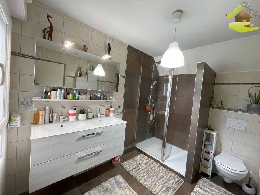 À l’étage, 3 chambres lumineuses, une salle d’eau moderne avec douche italienne posée en 2025, double vasques et WC.