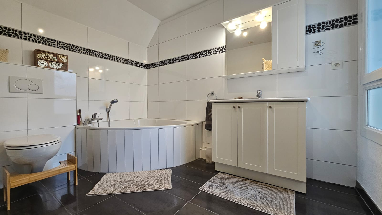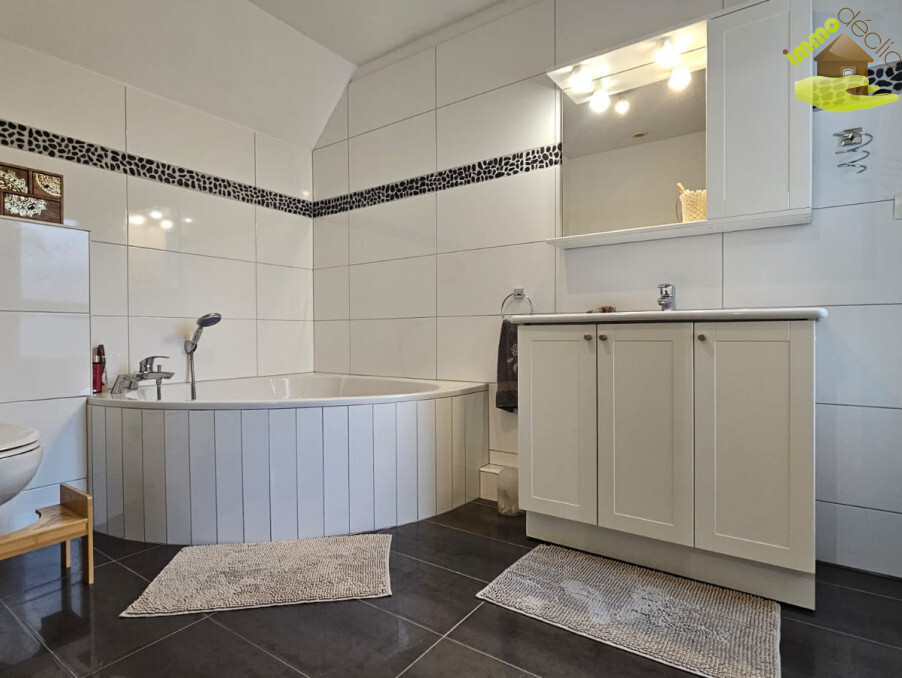 À l’étage, 3 chambres confortables, une salle de bain avec baignoire, vasque, WC et fenêtre