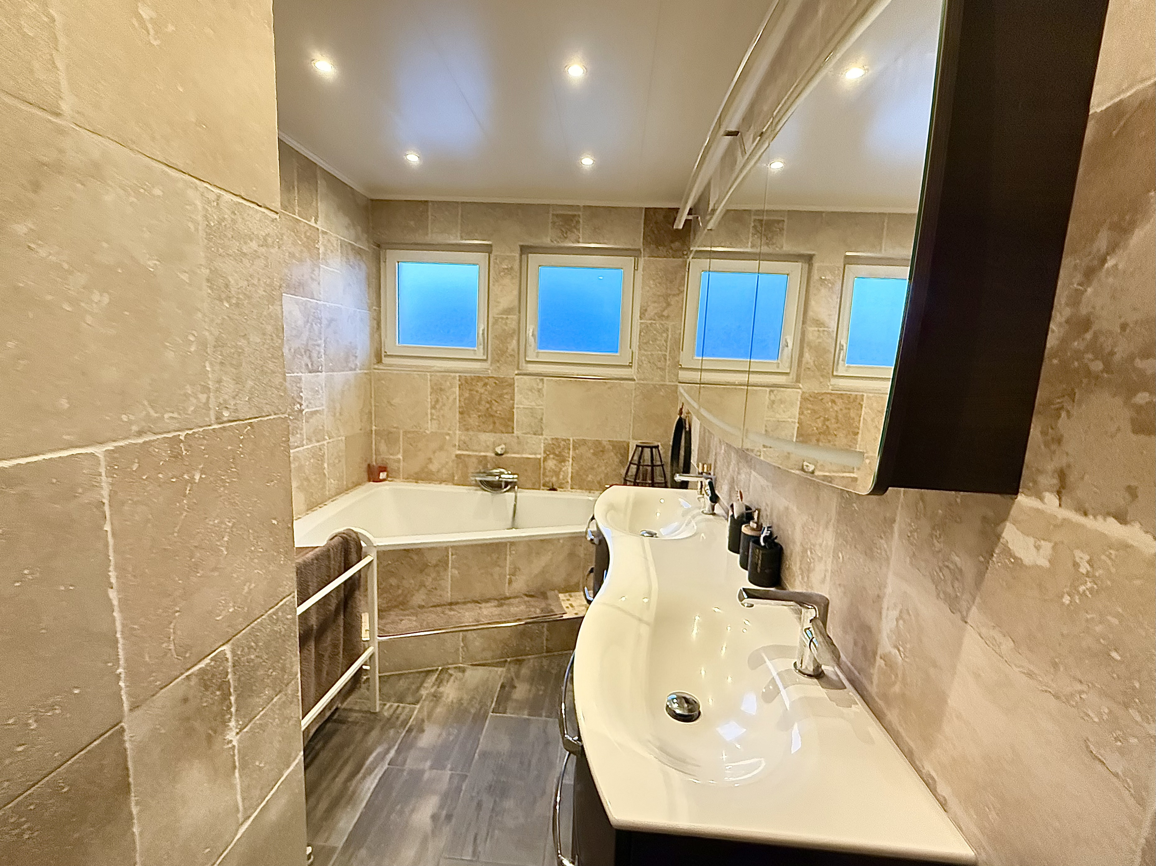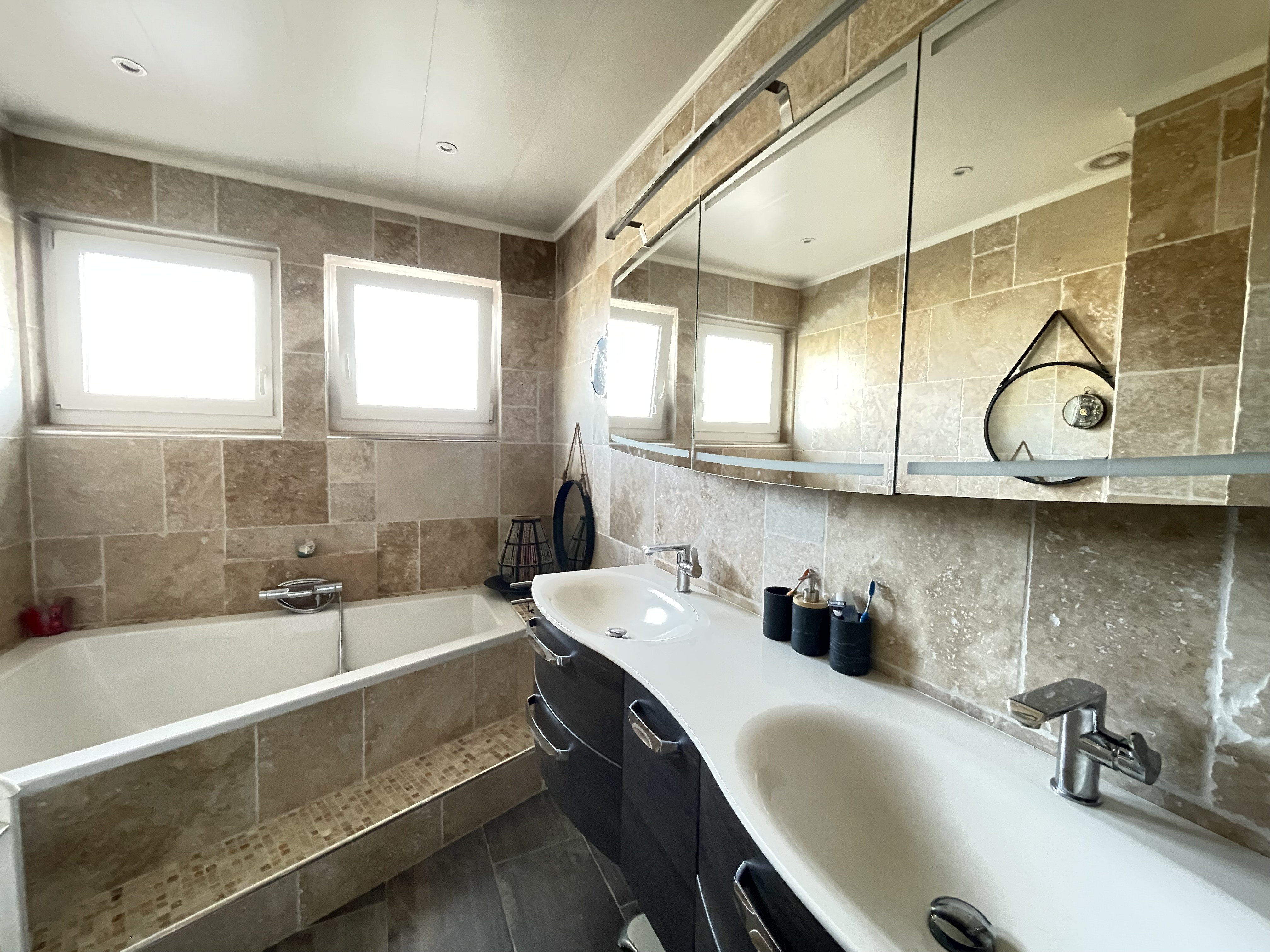 Belle salle de bains équipée d’une baignoire, et WC séparé avec lave-mains.